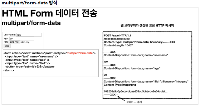 multipart/form-data 방식은 다른 종류의 여러 파일과 폼의 내용 함께 전송할 수 있다.
