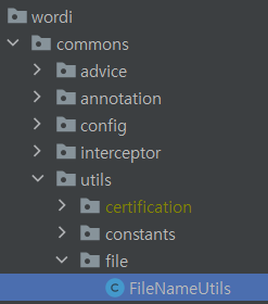 commons 패키지에 상수를 관리하는 utils 패키지에 file 패키지를 새로 만들고, 파일명 처리 메서드를 관리하는 FileNameUtils 클래스를 만들어준다.