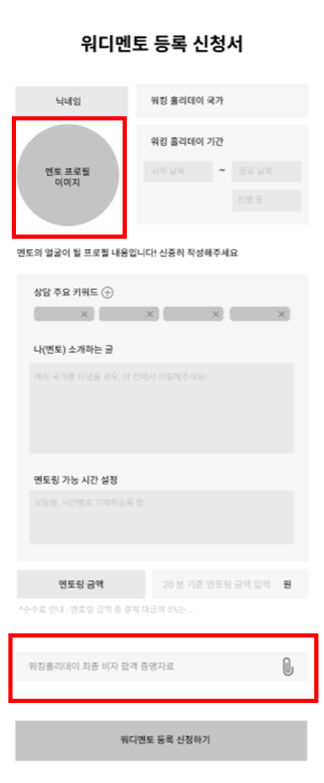 여기에 멘토 프로필 이미지를 등록하는 부분과 멘토임을 증명하는 증명서 파일을 등록하는 부분이 있다.