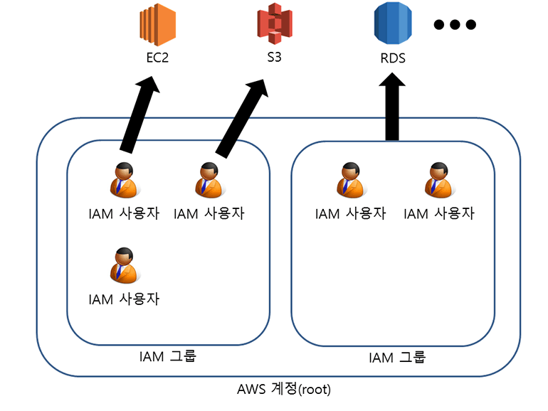 AWS root 계정 내에 IAM 사용자를 여럿 만들고 비슷한 권한을 갖는 사람들끼리 그룹으로 묶는 등 여러 사람들이 하나의 AWS 서비스 내에서 적절하게 권한을 위임받아 협업할 수 있도록 한다.