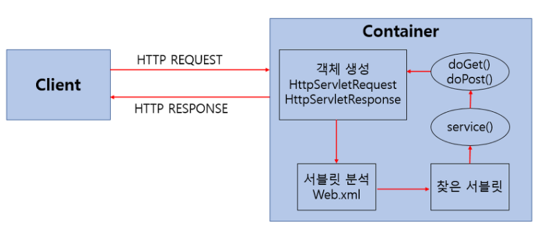 - Servlet Container에 스레드를 생성하고, res, req를 인자로 service를 실행