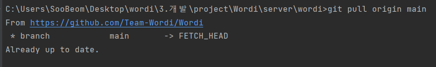해당 예시에서는 main 브랜치에 곧바로 작업하는 형태로 진행됐기 때문에 작업 전에 main 브랜치를 동기화하고 진행하였다.