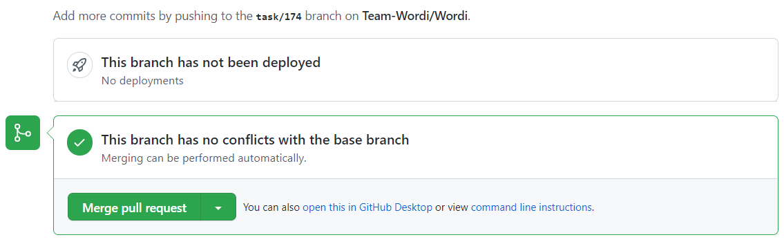 코드 리뷰 및 작업 사항이 모두 완료되면 PR 하단의 Merge pull request를 눌러 merge 시키도록 하자.
