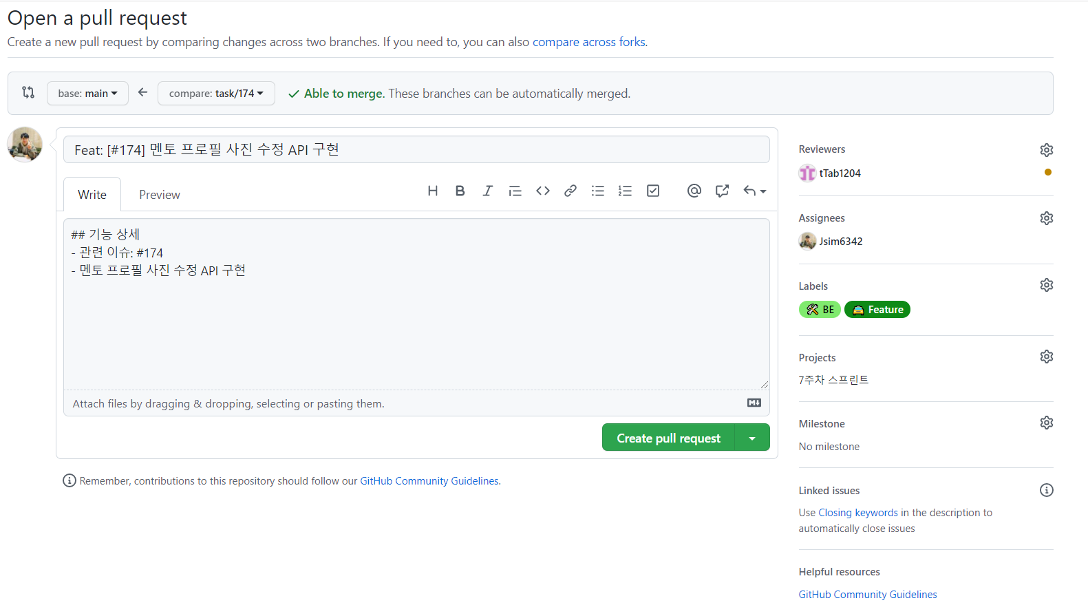 PR 오른쪽에는 해당 PR을 리뷰해 줄 팀원과 작업한 사람, 작업 내용과 관련된 Label, Projects, Milestone, Linked Issues 등을 설정할 수 있다.
