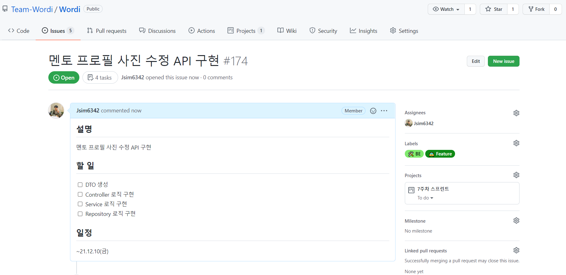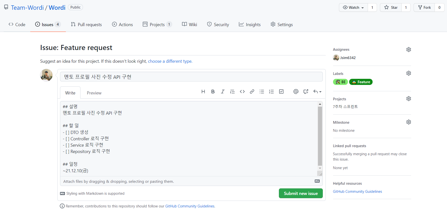 사진은 워디 프로젝트의 Issue 양식에 맞춰 이슈를 작성한 모습이다.