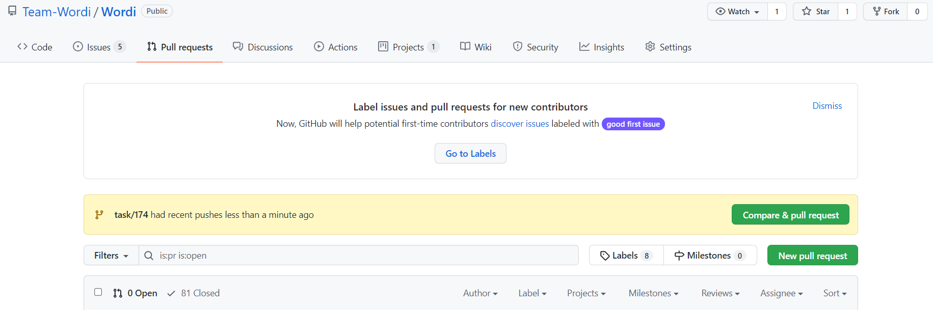 해당 버튼을 누르거나, Pull Requests 페이지에서 New pull request 버튼을 눌러 Pull Request를 생성할 수 있다.