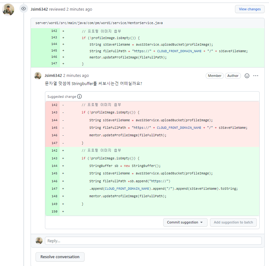 기존에 작성한 코드는 빨간색, 리뷰를 제안한 코드는 녹색으로 뜨면서 작업자가 편리하게 제안한 코드를 확인할 수 있다.