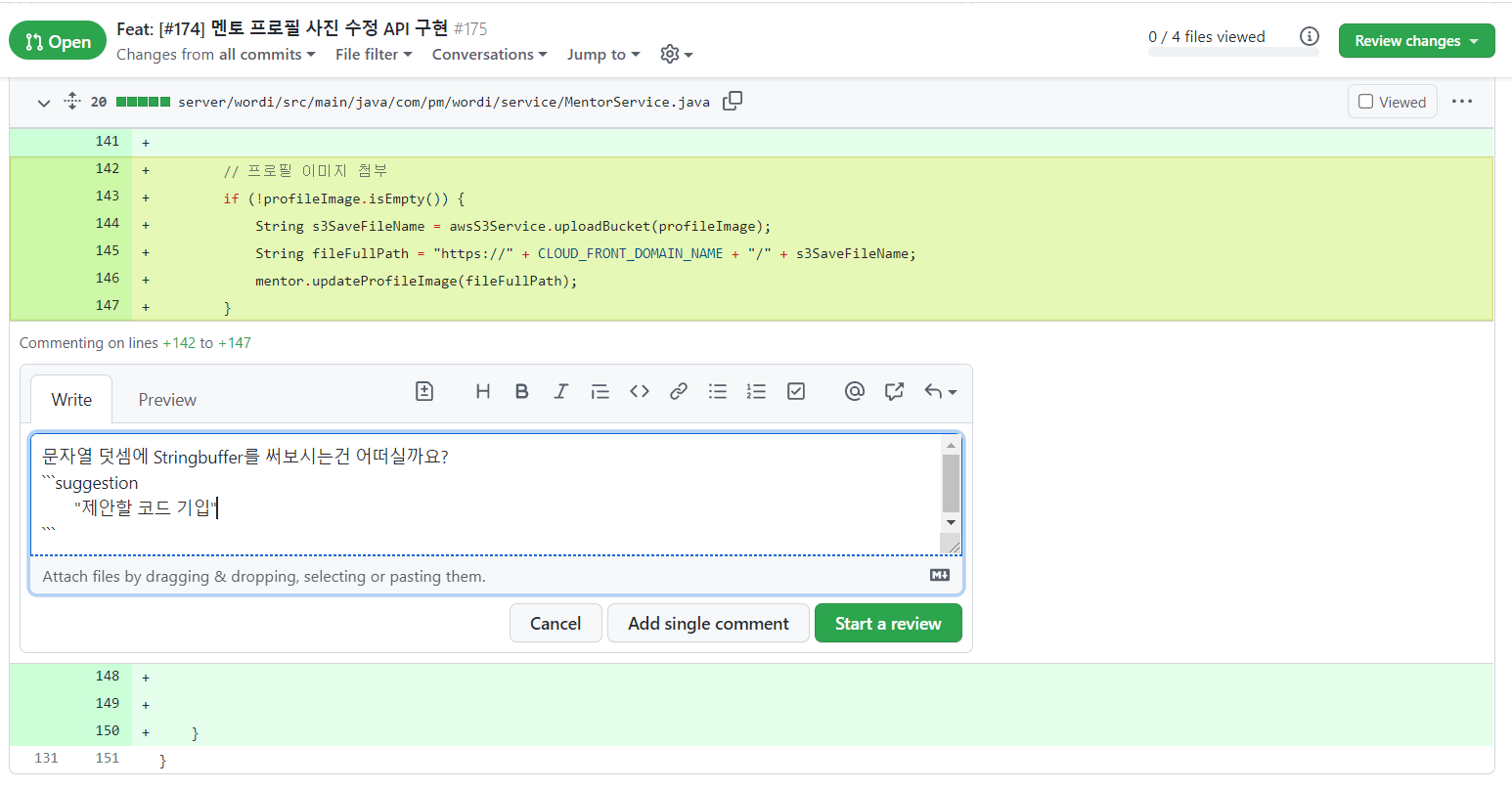 리뷰는 여러 개를 한 번에 남길 수 있으며, 제안할 코드 등을 기입할 수도 있다.